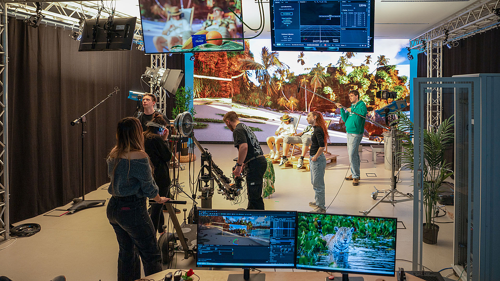 Studierende aus fünf Ländern arbeiten gemeinsam im modernen Virtual-Production-Studio der Hochschule Mittweida.
